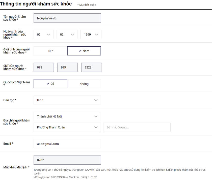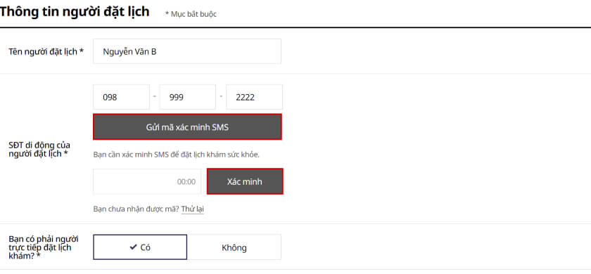 - Điền đầy đủ các “Thông tin người đặt lịch” (Các thông tin có dấu * là bắt buộc)