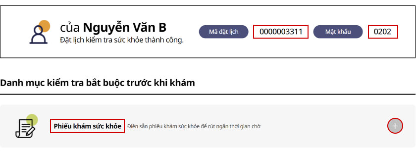 - Sử dụng Mã đặt lịch & Mật khẩu để hoàn thành “Phiếu khám sức khỏe” trên hệ thống trước ngày khám giúp rút ngắn thời gian chờ