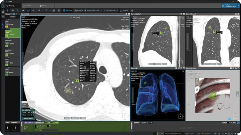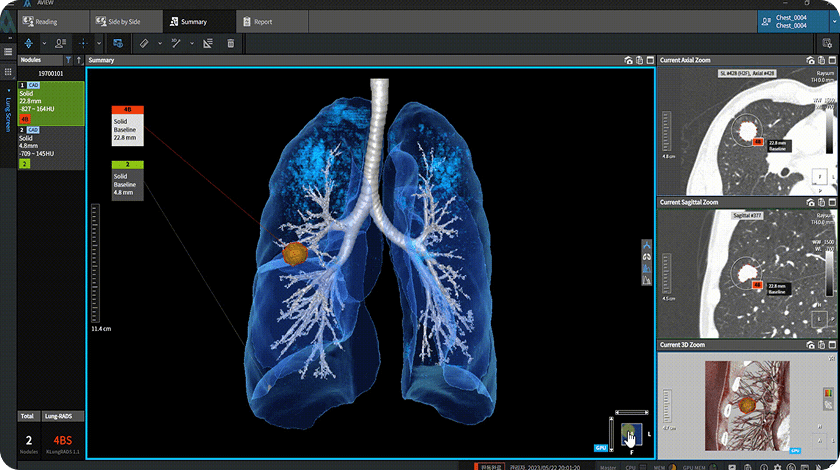 미세 결절을 발견하면 기본 정보, 결절 개수, 크기 및 상태, RADS 범주 등 다양한 정보를 얻을 수 있습니다. 폐암으로 발전할 가능성이 있는 소견도 미리 확인하여 작업 시간을 단축하고 사례에 따라 효율적인 판독을 가능하게 합니다. 미세 결절 검출: 결절 개수, 크기, 상태, RADS 범주에 대한 포괄적인 정보 제공 잠재적 폐암 발생을 조기에 발견하여 시간 효율적인 스캔 판독을 가능하게 합니다.