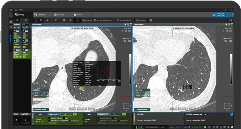 aview LCS는 단순한 이미지 비교를 넘어 폐 결절을 매칭하여 성장과 변화를 자율적으로 평가합니다. aview LCS는 미국 영상의학회에서 권장하는 폐 CT 스크리닝 보고 및 데이터 시스템(Lung-RADS ver 1.1) 가이드라인에 따라 폐 결절을 관련 범주로 효율적으로 분류합니다.